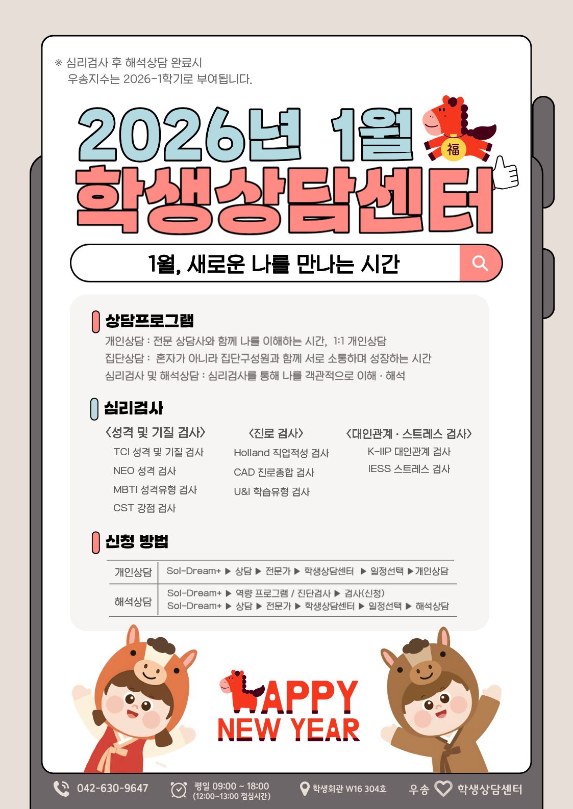 커뮤니티 공지사항 학생활동 동아리 학과뉴스 임상관찰 자료실 카드뉴스 STAR APP 관련사이트 공지사항Home커뮤니티공지사항 2026학년도 학생상담센터 홍보 포스터(1월) 작성자 : 학과관리자 | 작성일 : 2026.01.06 | 조회수 : 16 첨부파일 학생상담센터 26년 1월 홍보포스터.jpg 목록 이전글 이전 글이 없습니다. 다음글 2026년 1월호 우송취업 뉴스레터
