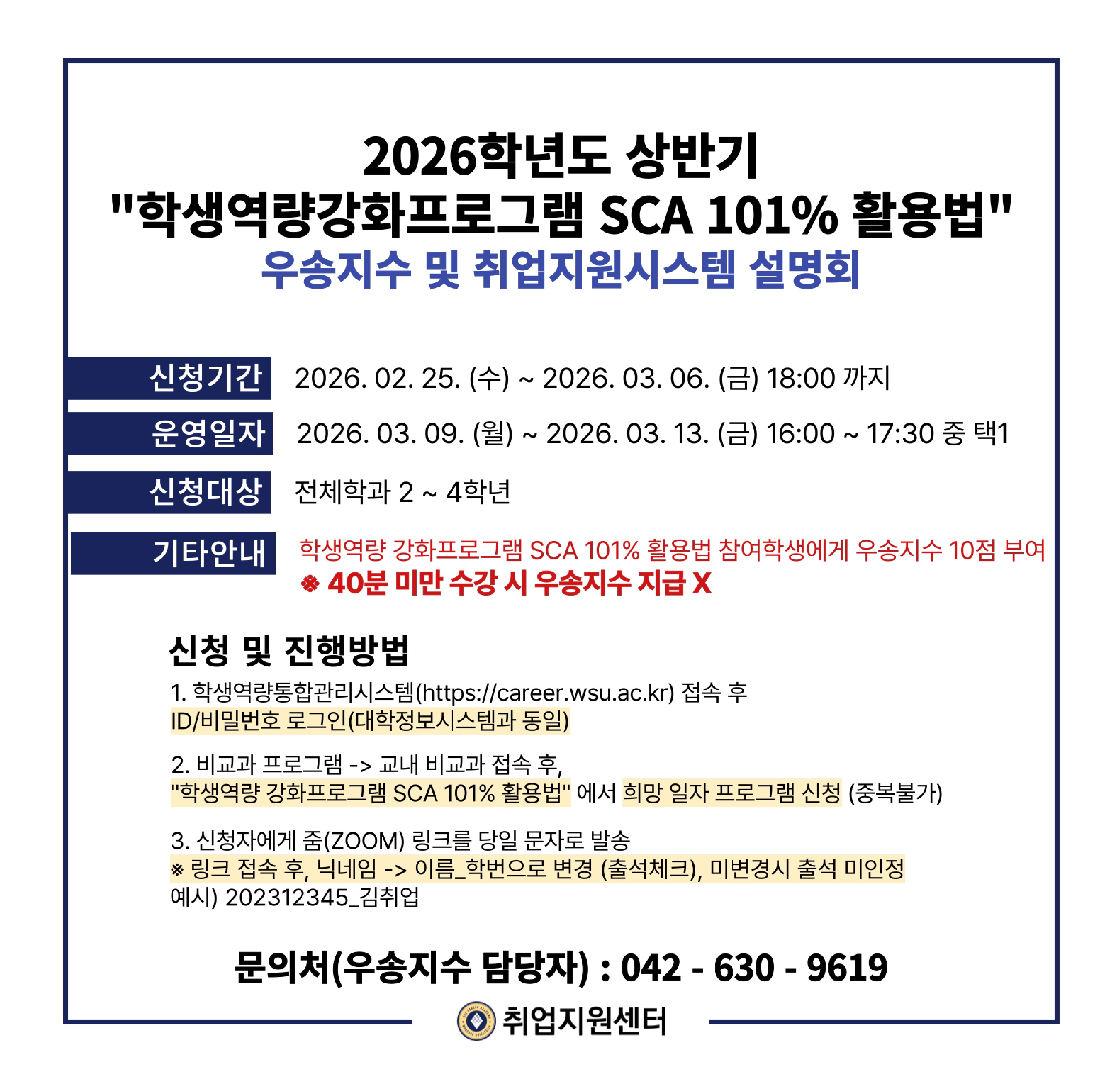 2. 취업지원센터에서는 2026학년도 상반기 재학생 "학생역량강화프로그램 SCA 101% 활용법" 설명회 신청 및 접수를 진행하오니 각 학부(과)에서는 협조하여 주시기 바랍니다.